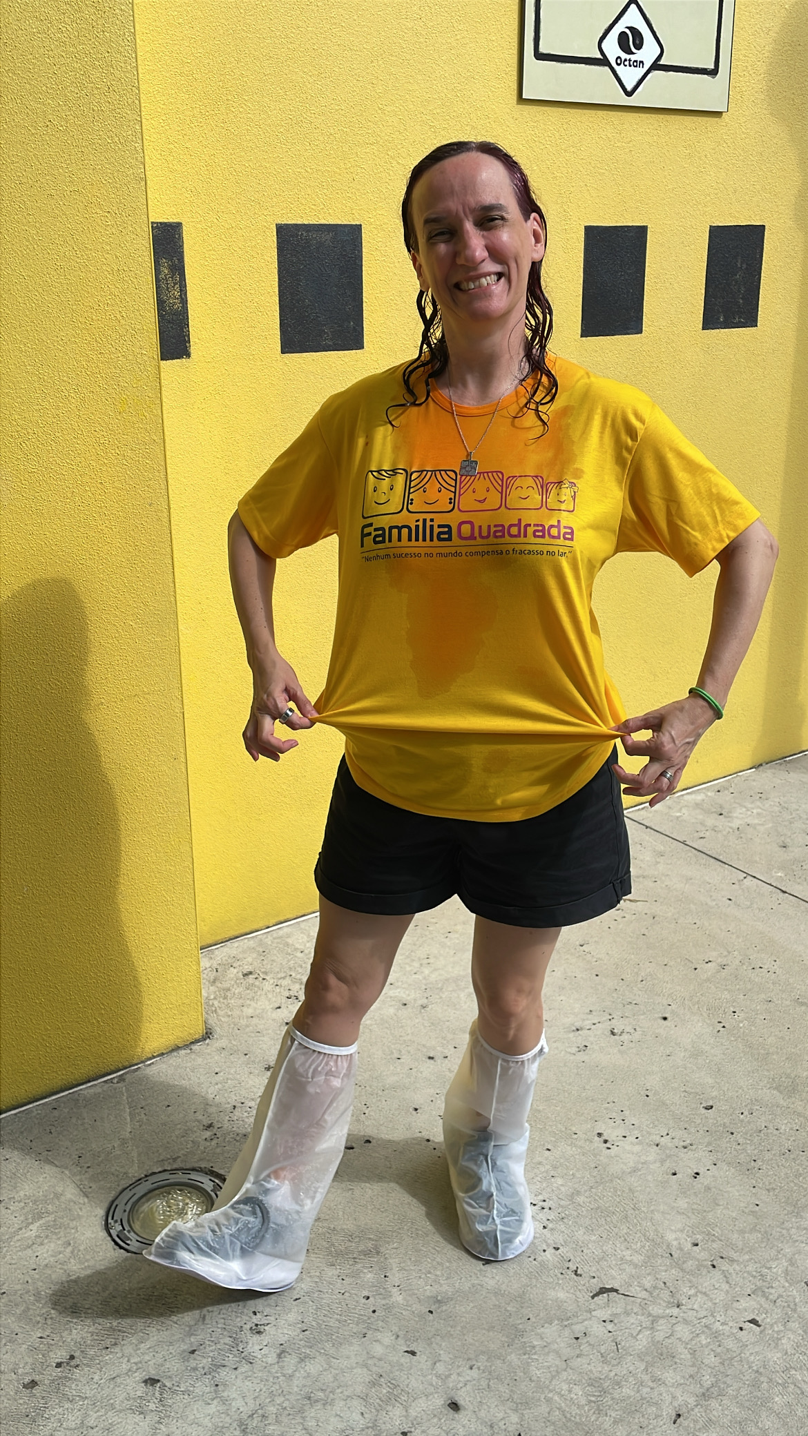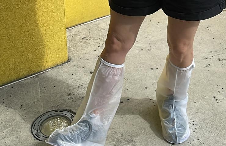 Um dos utensílios mais úteis da viagem: minha capa de chuva para tênis, que me salvou tanto nos brinquedos que molham, quanto nas chuvas fortes e repentinas que caíram ao longo da viagem (e que deixaram os tênis da Amanda e da Lelê molhados e chulezentos).