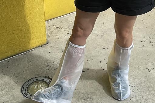 Um dos utensílios mais úteis da viagem: minha capa de chuva para tênis, que me salvou tanto nos brinquedos que molham, quanto nas chuvas fortes e repentinas...