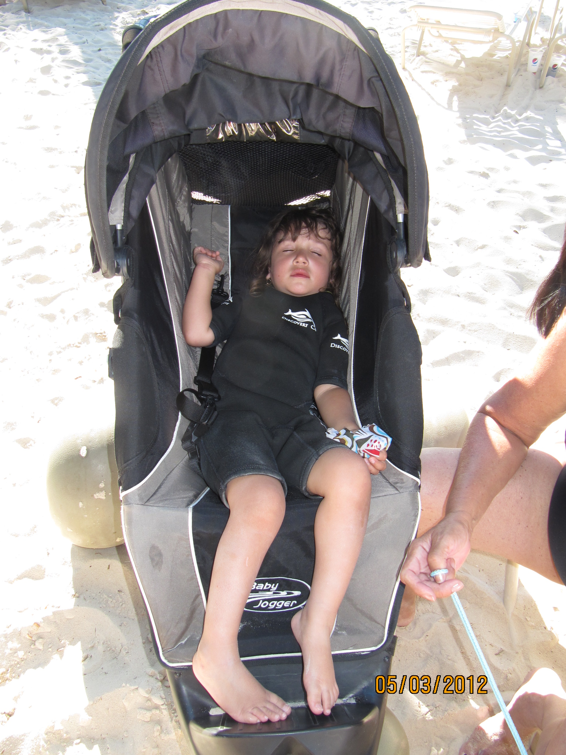 Como a Letícia estava em seu carrinho, um funcionário veio trocá-lo por um carrinho muito maneiro, adaptado para andar na areia. Logo depois, tiraram uma foto nossa, que também estava incluída no pacote.